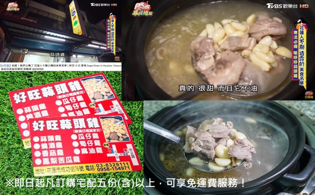 『好旺蒜頭雞』秉持著用心做料理的態度,誠摯的服務每位顧客,嚴選新鮮食材,在材料的使用上也毫不吝嗇,相當大方,延續二十年前的古早味烹調方式,用炭火加上陶鍋熬煮,木炭穩定的高溫,使湯汁不易被吸乾,還能在短時間內將蒜頭和雞肉在陶鍋中煮沸,鬆軟綿密的蒜頭與雞湯、雞肉完美融合,濃郁的湯頭,更令人沒齒難忘,是許多來訪花蓮的網友們,爭相推薦的好料理唷!